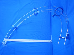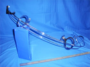 | 本品は線形φ4の材料を3本、R400に曲げ加工し、リング形状に抜いた板材で固定し溶接した製品です。この3本のR形状の線材の間に球がスムースに一定の速さで転がる仕組みになっており、他部品との嵌合品でもあります。 各々単品部品では簡単な加工品に見えますが、写真のように傾斜(3次元)の形状製品で長さはL=1300程度ある為、バネてしまい組み込みや固定に難点がある製品です。しかし精度も線形部品と板金部品との固定位置にもコンマ代の精度が必要とされました。 最も必要とされた点は量産時の溶接での精度を維持し、リードタイム短縮の為の治具でした。 |